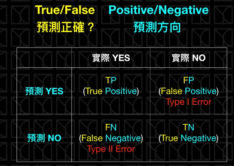 因為實際為 False,無論預測為 Positive 還是 Negative,都會希望他不要出現,因此兩種狀況被稱為 Error
